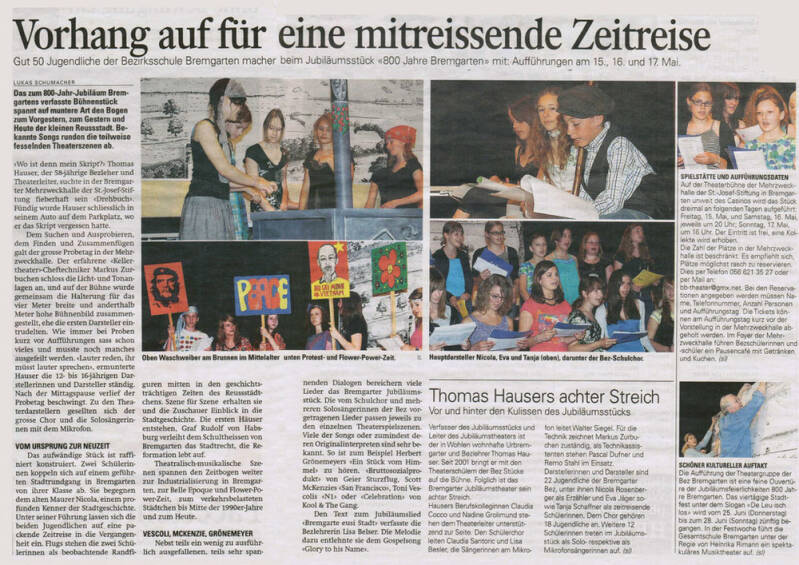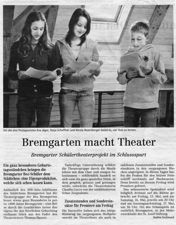 Dieses Stück wurde speziell zum 800-Jahr-Jubiläum von Bremgarten geschrieben. Es könnte als Beispiel für andere Jubiläumstheater dienen. Interessant bei diesem Stück ist das Zusammenspiel von Musik und Theater.