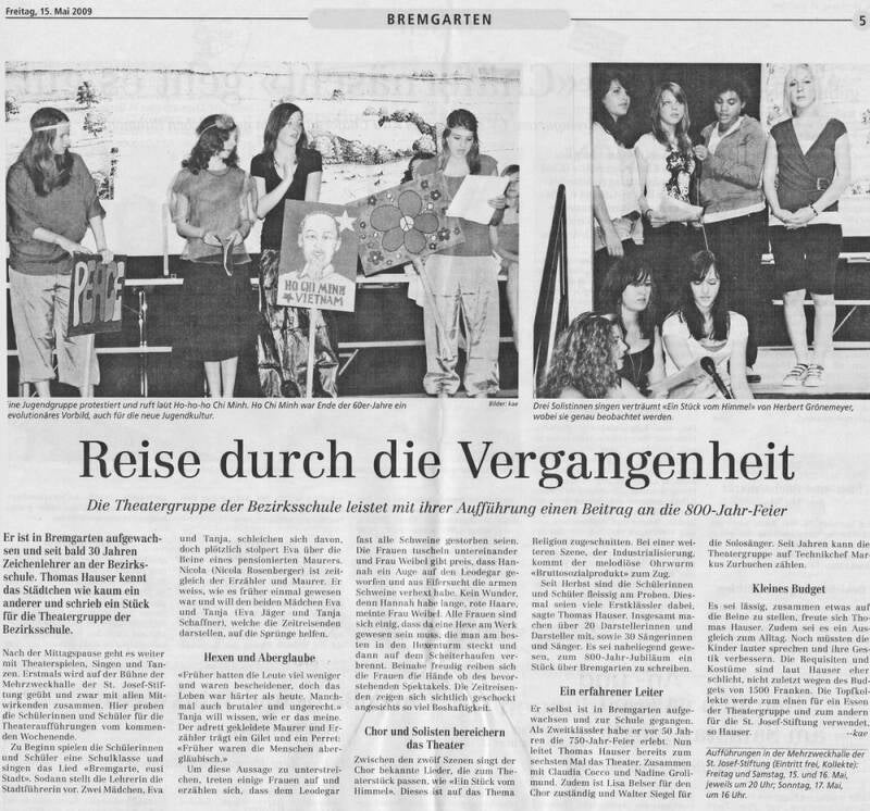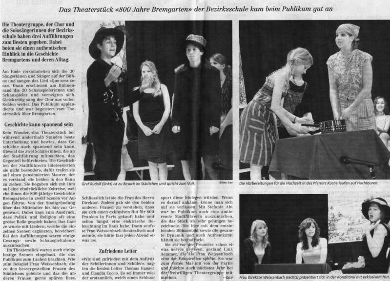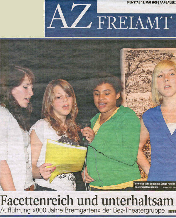 - ... das Theater war genial von Ideen, dem Humor, der Musik, der Zeichnung (wachsendes Bremgarten), der Schauspielleistung der Schülerinnen und Schüler, der Aufbau mit der Hintergrundgeschichte, wie die Texte zu den Personen passten. Herzliche Gratulation! Ich habe diesen Abend sehr genossen! (Johannes)